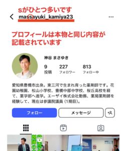 インスタグラムに、神谷まさゆきのなりすましアカウントがあるようです。